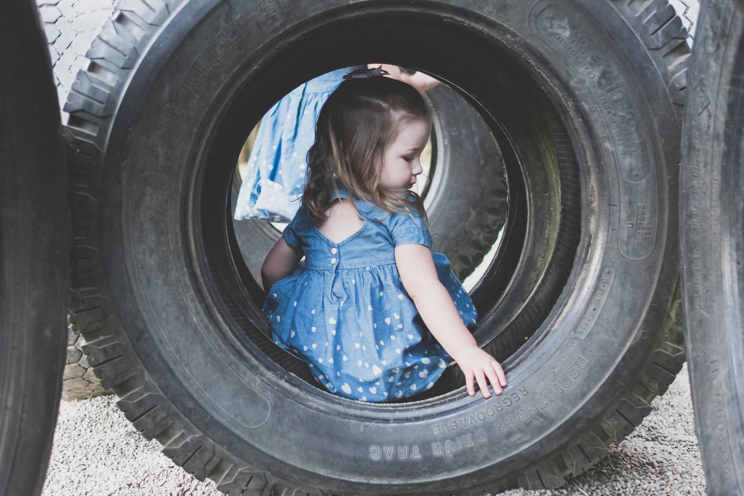 A little girl wearing a blue dress, sitting inside of a large vehicle tire, representing the advice Johnson Miller Family Lawyers provides in family and divorce matters in Windsor-Essex, including second marriages and pre-nuptial agreements (pre-nups).